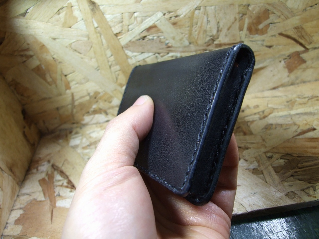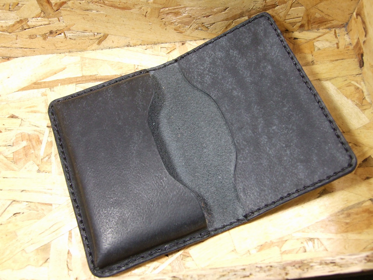 外装サドレレザー黒1.4ミリ厚に内装プエブロレザーの1ミリ厚を使いました。