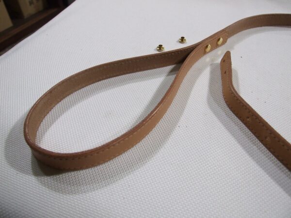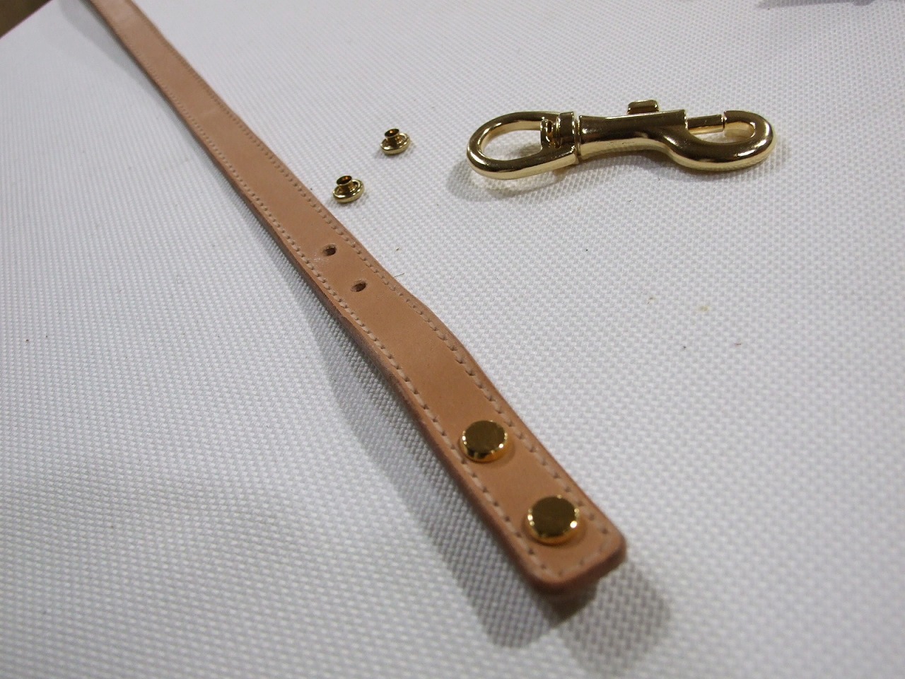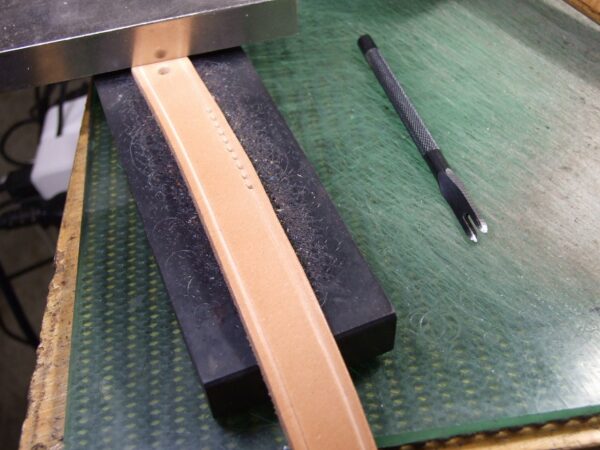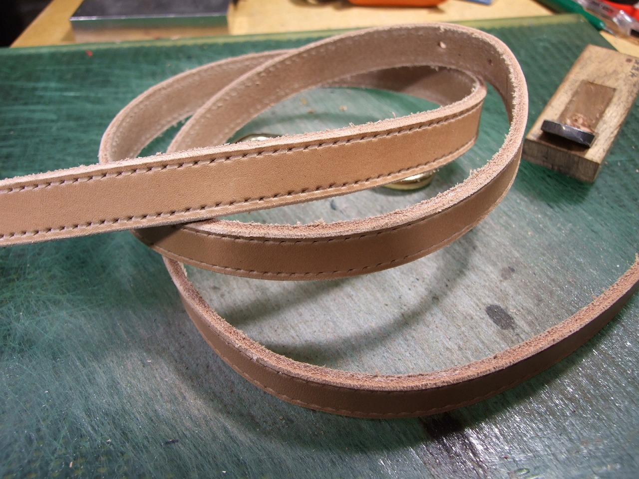 ドッグリード 制作中 2025年12月7日 sin 引く続きドッグリード制作中です。 幅18mm長さは金具抜きで1m7cmで設定しました。 穴あけヘリ磨きまで完了したのでエンジステッチで手縫いしていきます。