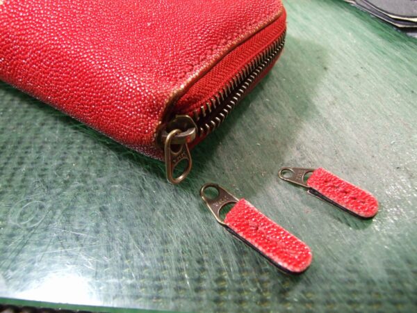 ファスナーの取手 2025年3月2日 sin 10年前に作らせて頂いたスティングレイ赤のファスナーロングウォレットの取手を修理しました。 SCHOTT(ショット)のライダースとパーカの取手もご要望頂き待って頂き作りました。 ライダースにはパイソン、パーカーにはスティングレイ黒を使いました。 ライダースとパーカーは全身画像撮り忘れました。
