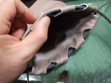 レザー巾着 考案中 2026年1月11日2026年1月11日 sin 前回のグレーでいい感じかと思ったのですが 少し引っかかる部分があり、入り口をもう少し閉じたかったので 2,3日考えた結果、縁に24mmの穴を開けてみて締めてみた ...続きを読む