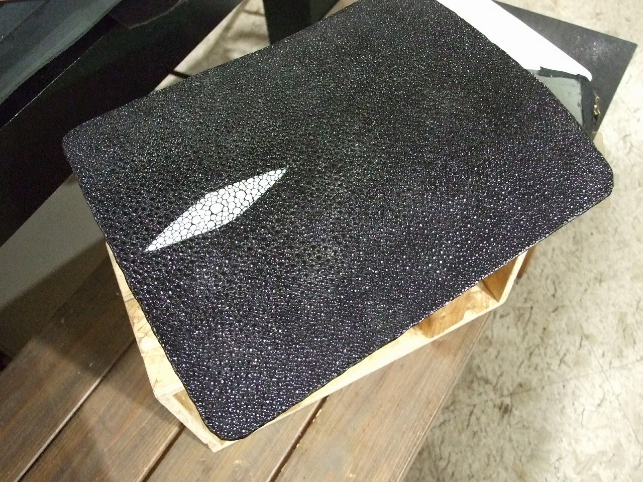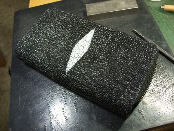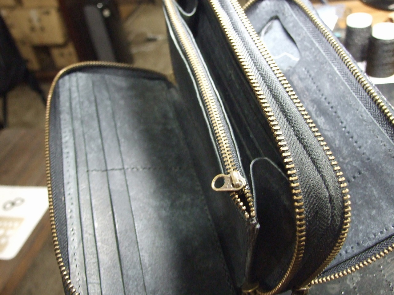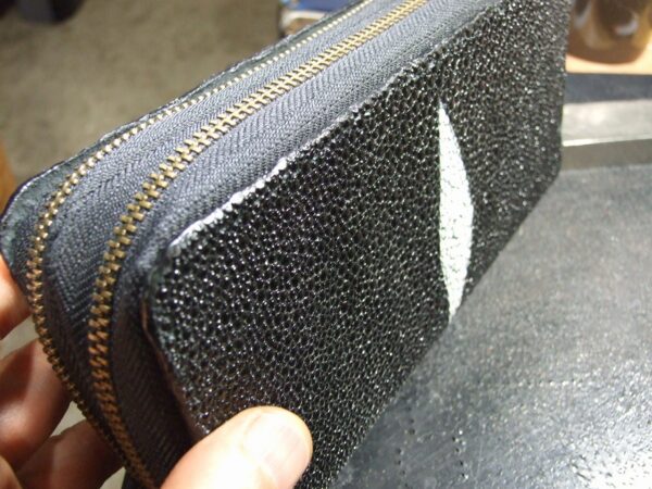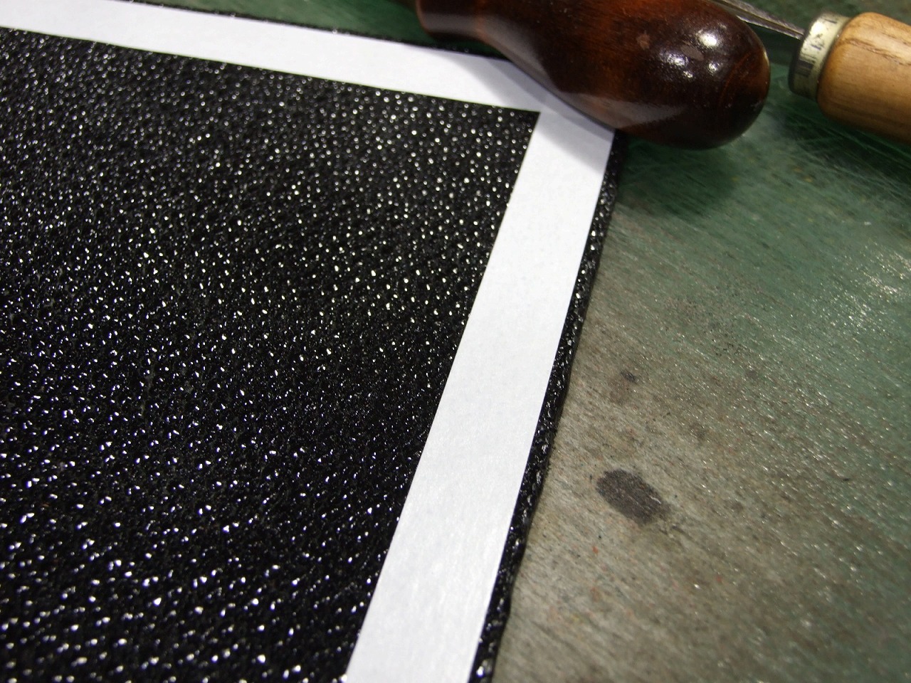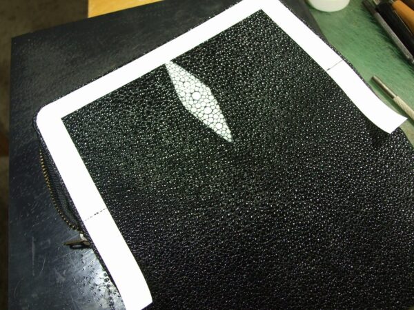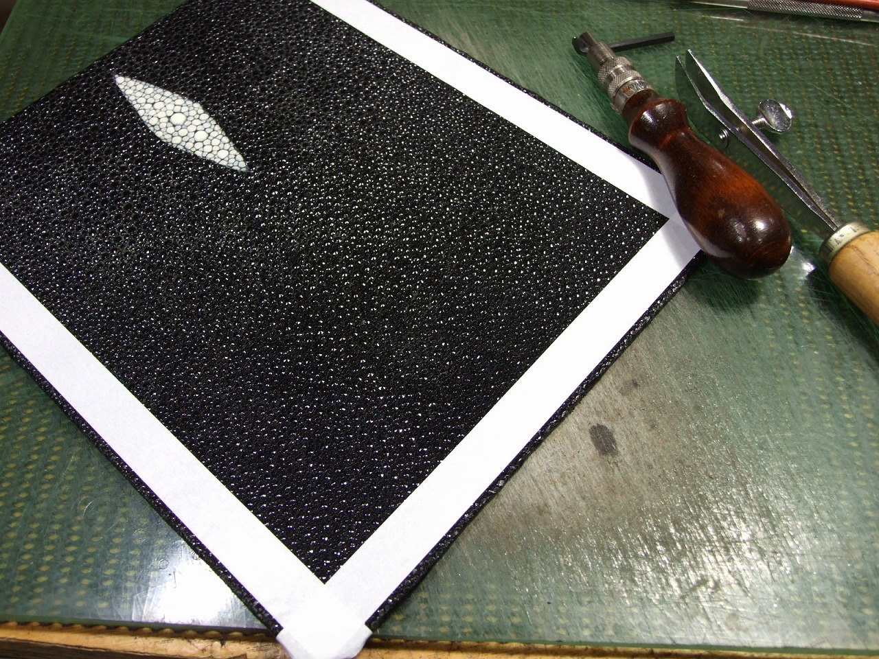 galaxy-s25-ultra用ダブルファスナーケースウォレット 制作中 2025年11月9日 sin 外装のスティングレイと内装のプエブロの縫いの穴あけ完了です。 いつもはグルーバーかネジ捻で無理やりガリガリ線を引くのですが 今回はマスキングテープでやってみました。 穴あけ後一度剥がしてスマホのカメラの穴を開けて Dカンと取手を着けます。