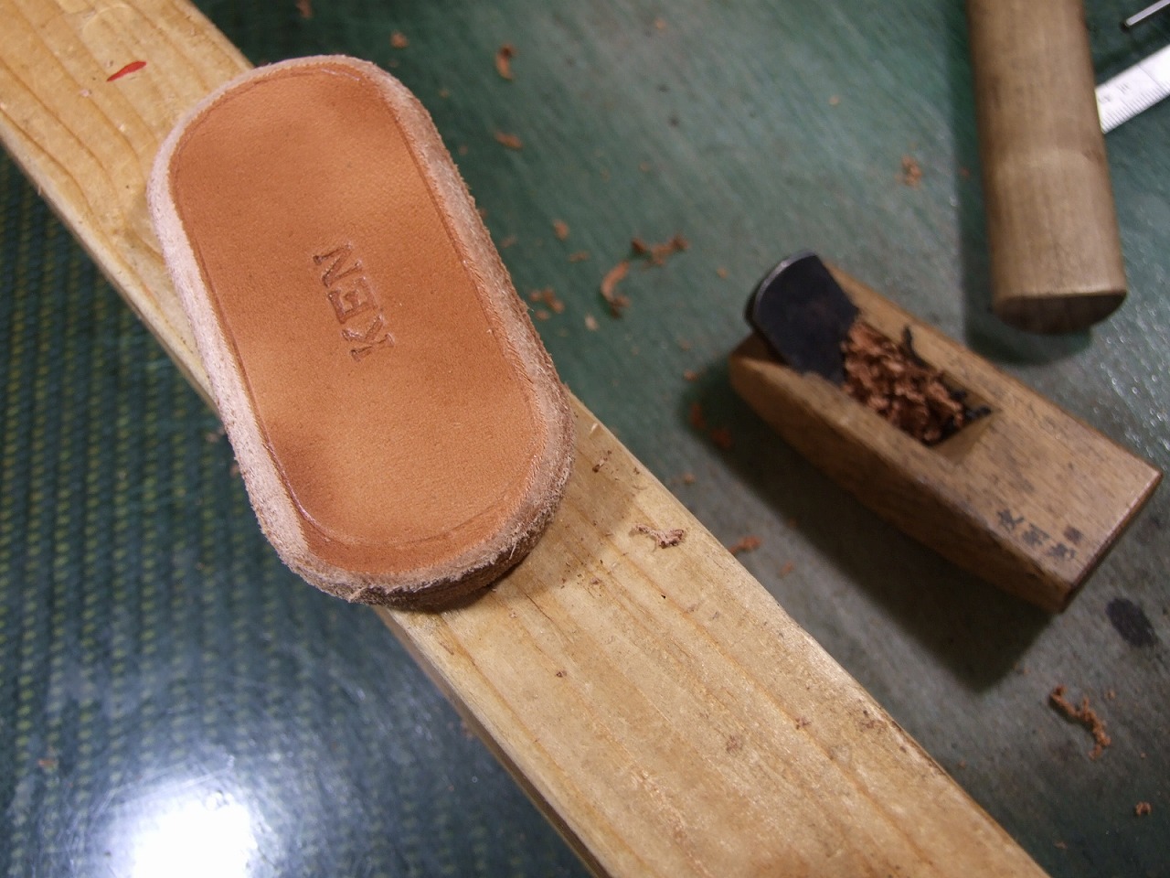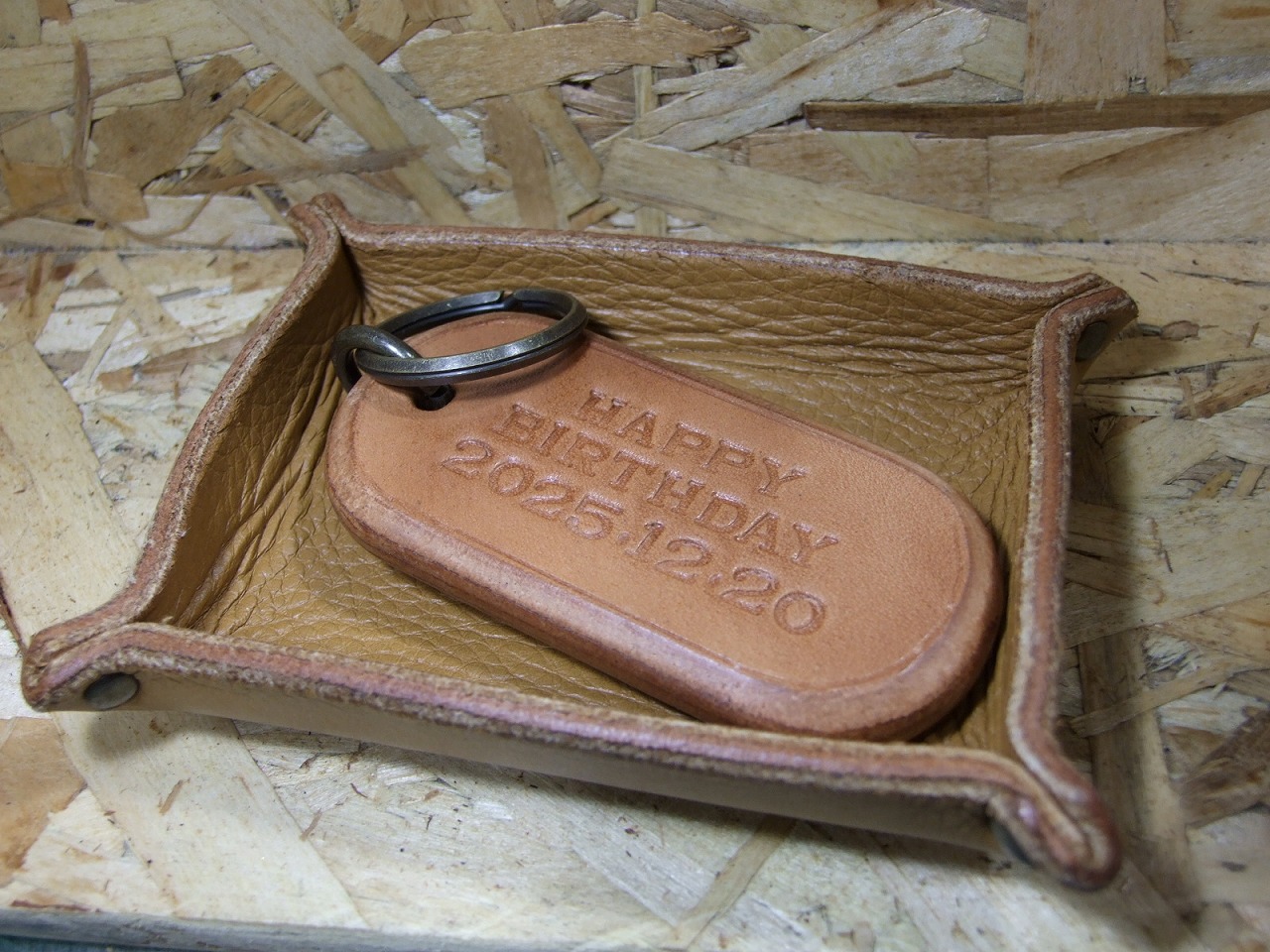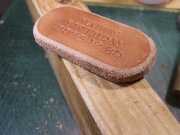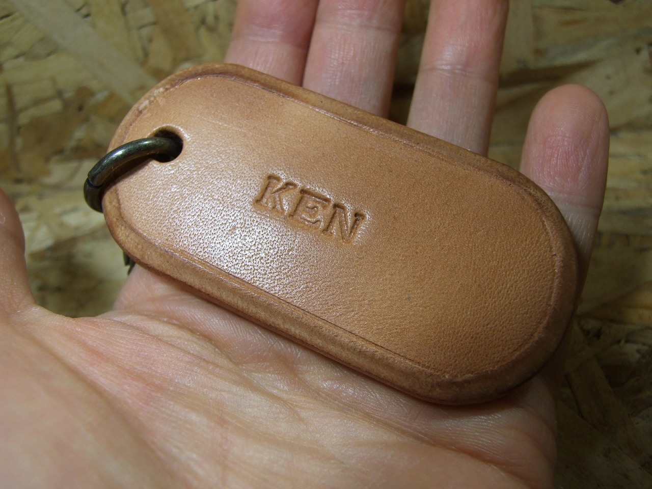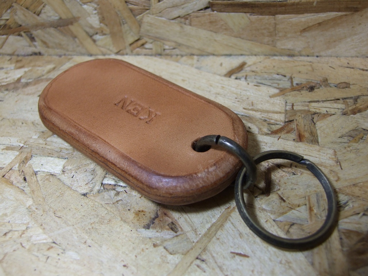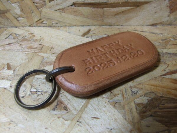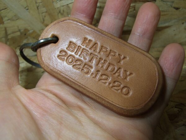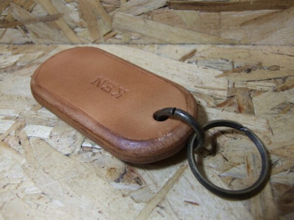 オーダーキーホルダー 2025年10月31日 sin オーダー頂いたキーホルダー完成です。 2ミリ厚のサドルナチュラル2枚に刻印を打って 2ミリ厚の床革をサンドして5枚重ねて10ミリ厚にしました。 43ミリ×85ミリで作りました。